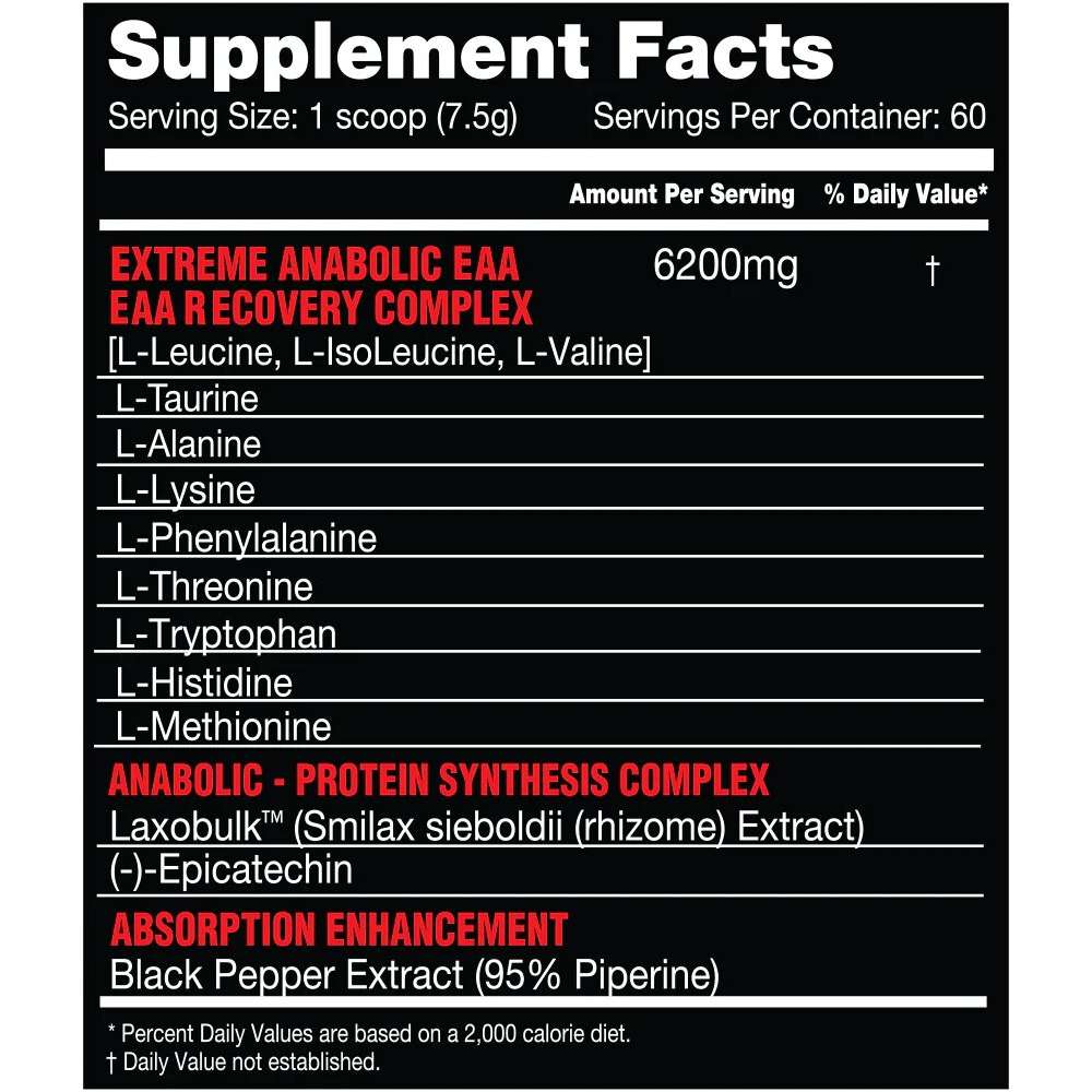 Los aminoácidos esenciales de Brute EAA de Killerlabs hacen énfasis en la leucina, isoleucina y valina, los cuales son un poderoso estimulante para que los músculos crezcan, además de combatir el catabolismo muscular.