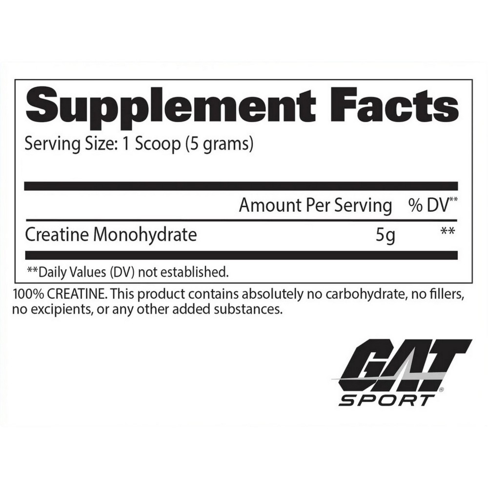 La creatina monohidratada es el tipo de creatina más estudiado. Se forma naturalmente en el tejido muscular, específicamente en las células. La creatina de GAT no contiene carbohidratos, rellenos o cualquier otra substancia, solo 100% creatina monohidratada con una pequeña adición de creatina micronizada para una rápida absorción.