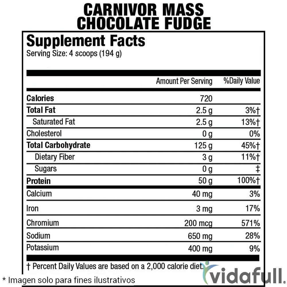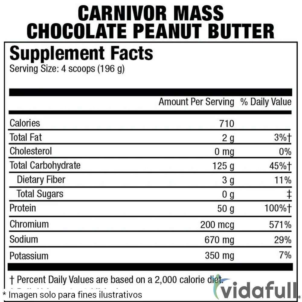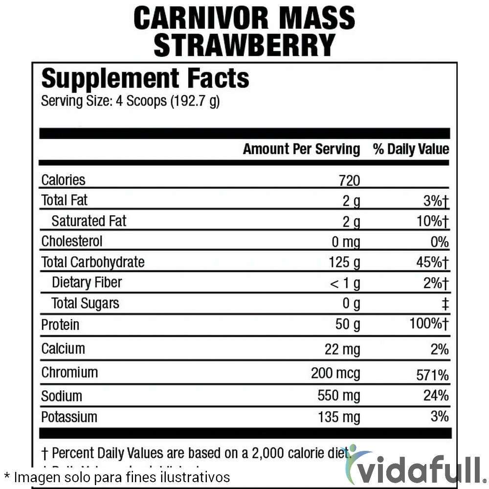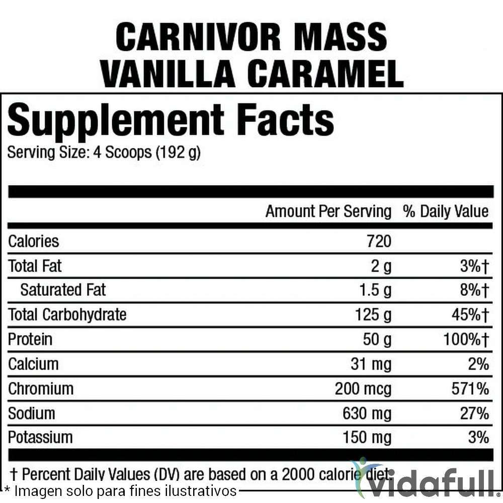 Carnivor Mass viene en sabores como Chocolate peanut butter, chocolate fudge, vanilla caramel y strawberry. Cada envase contiene 2.67 kilogramos y aporta 14 porciones. Es importante recalcar que una porción equivale a cuatro scoops de proteína. Cada porción equivale a 714 calorías; el contenido calórico puede variar dependiendo el sabor.
