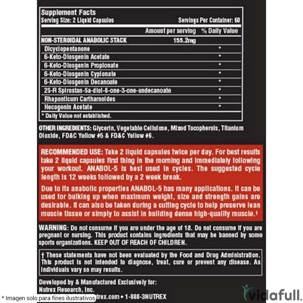 Para ayudar a asegurar un rápido inicio de sus efectos, Anabol 5 utiliza cápsulas líquidas de rápida absorción. Cada botella es un suministro completo para un mes. Anabol 5 es más eficaz cuando se toma en ciclos. La duración del ciclo sugerido es de 12 semanas seguido de un período de 4 semanas de descanso.