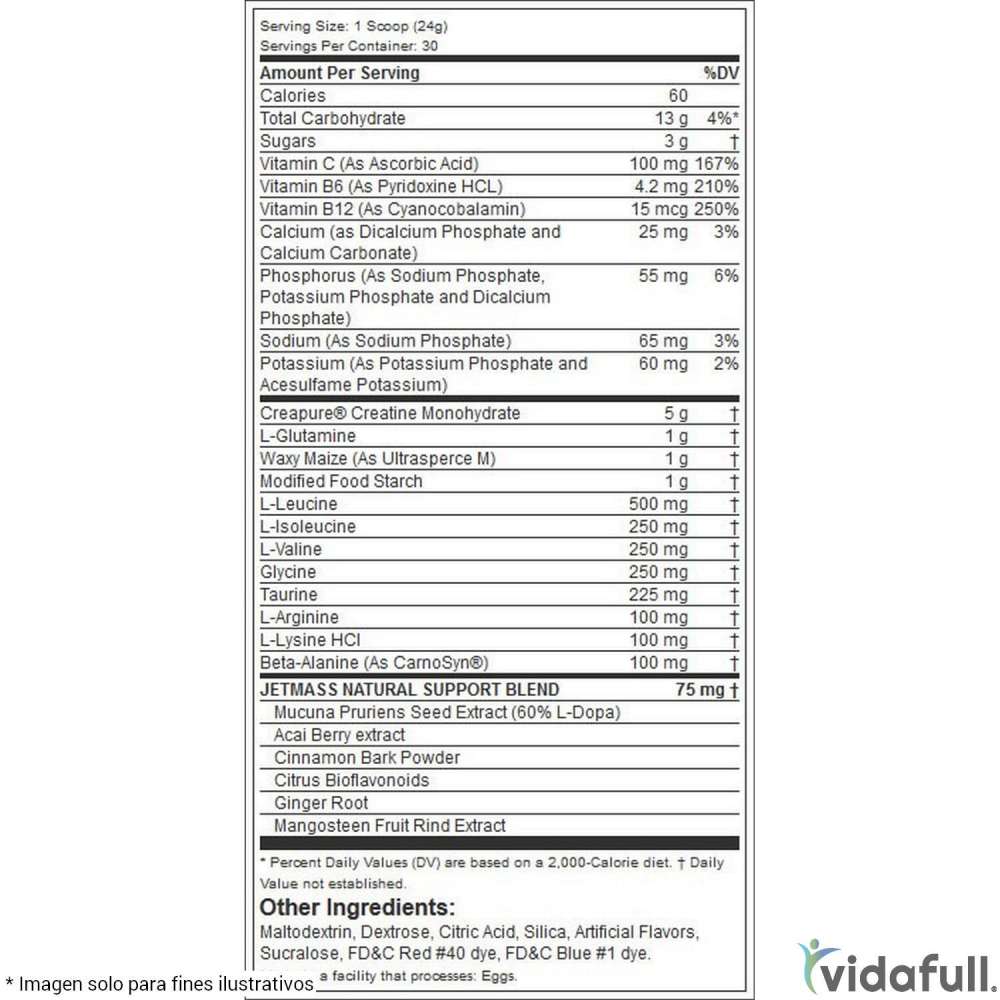 Malto dextrina, dextrosa, sabores naturales y artificiales, ácido málico, ácido cítrico, sucralosa, Rojo # 40, Azul #1.