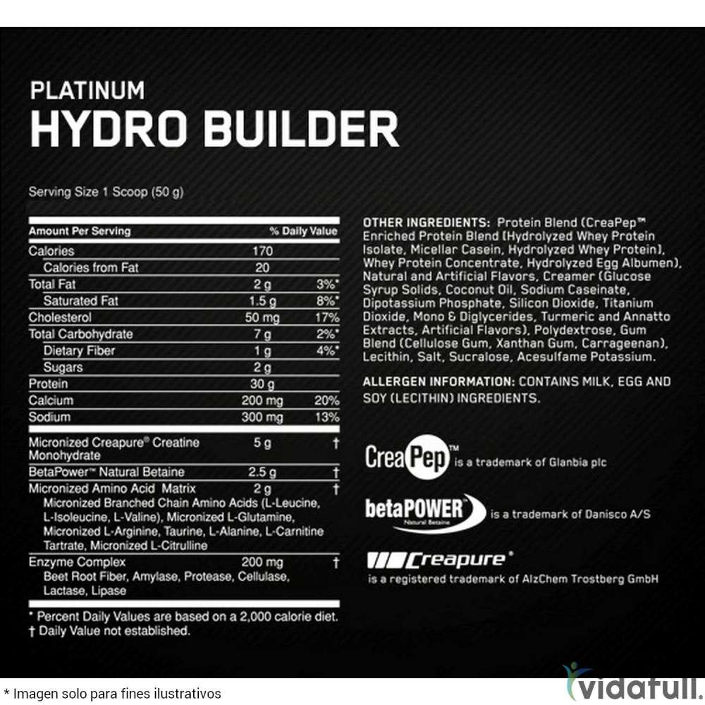 Los principales ingredientes de la fórmula de Platinum Hydrobuilder de Optimum Nutrition son: