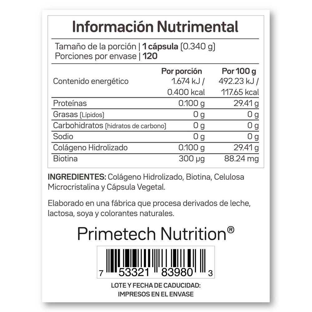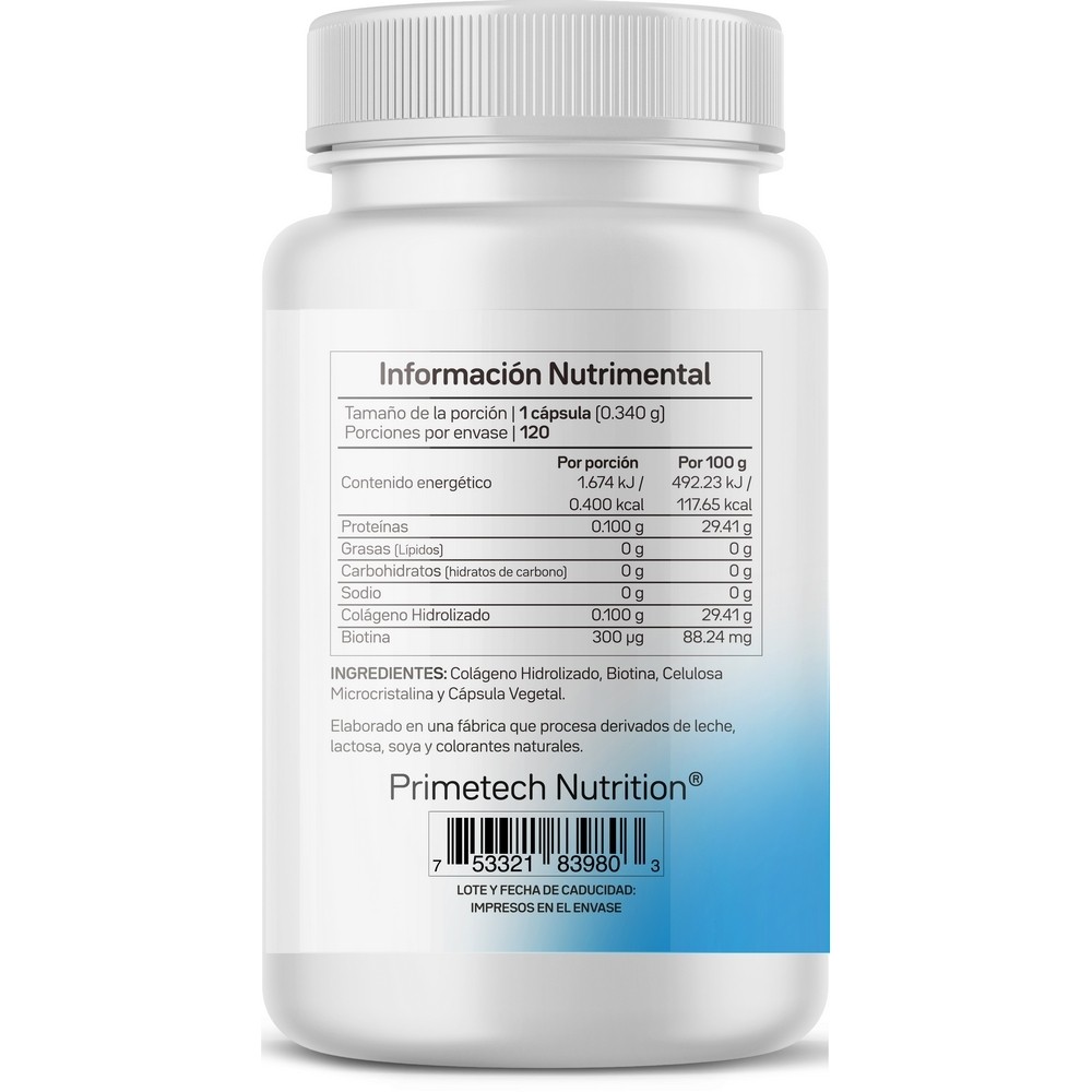 BIO C300 de Primetech es un suplemento de alta potencia que proporciona 300 mcg de Biotina pura por cápsula. La biotina, también conocida como Vitamina B7, B8 o Vitamina H, es una vitamina del complejo B soluble en agua que tu cuerpo utiliza en procesos metabólicos cruciales. Al ser una vitamina que no se almacena en el cuerpo, su ingesta diaria es fundamental. Primetech te ofrece una dosis precisa y de fácil absorción para asegurar que nunca te falte este pilar de la salud y la belleza.