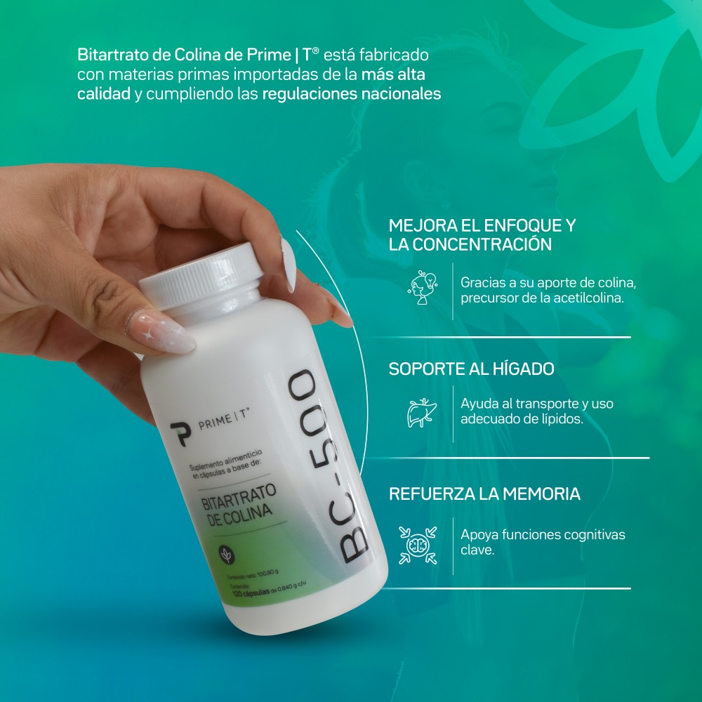 BC-500 de Primetech Nutrition es un suplemento esencial enfocado en el Bitartrato de Colina, un nutriente vital para la función cerebral y el metabolismo. La fórmula se potencia con Levadura de Cerveza, fuente natural de Complejo B. Cada frasco contiene 120 cápsulas con 500 mg de Colina por porción.
