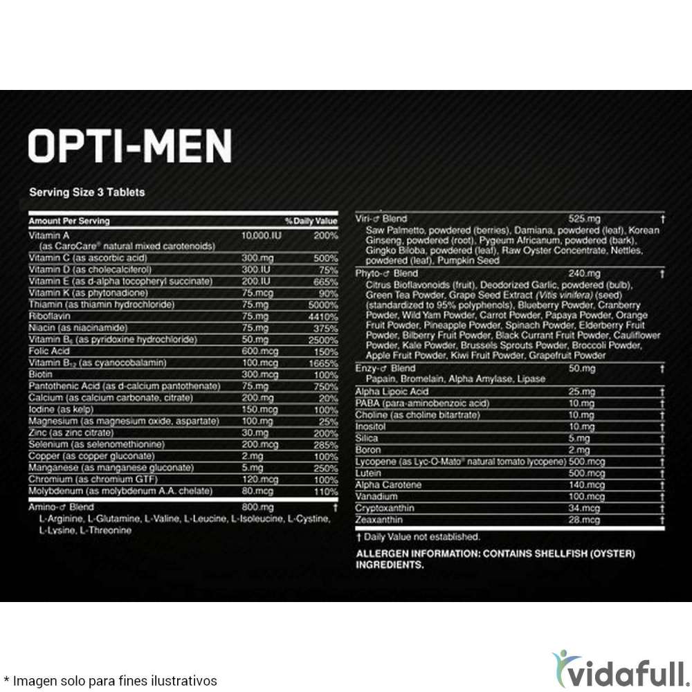 Entre sus ingredientes contiene las mismas vitaminas y minerales que Opti Men a menor gramaje; alrededor de un 30% menos.